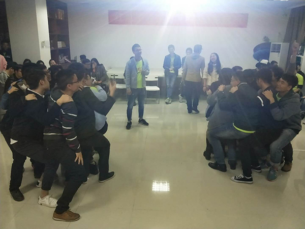 队员围成一个圈后挨个坐在后一个队员的腿上,形成紧密不倒的圈