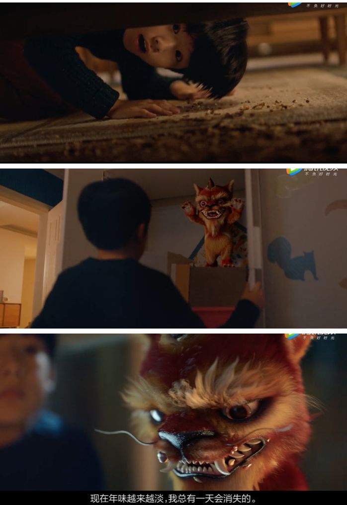 影片中,小男孩偶然发现家中有“年兽”。可惜因为年味太淡,年兽的身体也越变越小。为了拯救年兽,小男孩召集全家人一起出门迎新年。在热闹的气氛中,年兽终于恢复“真身”。