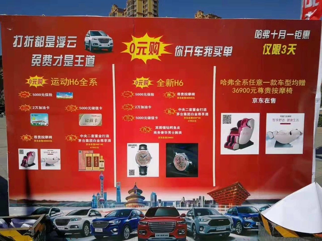 A)购11.3万车送:20000元加油卡+5000元保险+5000元保养卡+36900元头等舱按摩椅+47952元茅台白金酒厂出品白金尊享贵宾酒(8箱)。