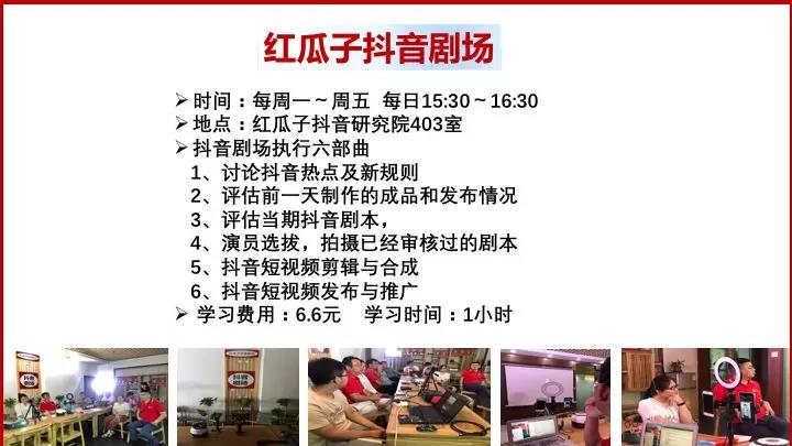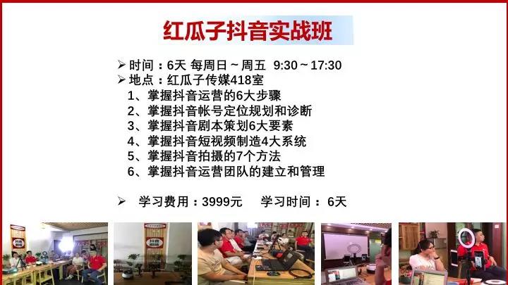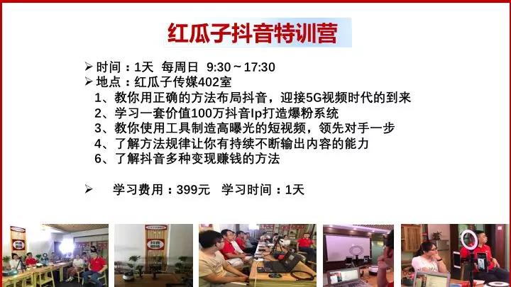 5G时代来临,信息以短视频形式来传播,抖音是全球短视频流量最大的平台,沃尔玛一条抖音增加2000万收入,一条抖音为华为手机单店增加650万收入,怎样用好抖音,对我们个人和公司都非常重要,红瓜子抖音研究院每天都有组织《抖音剧场》节目和每周日都举行《抖音特训营》培训,欢迎大家积极参加。