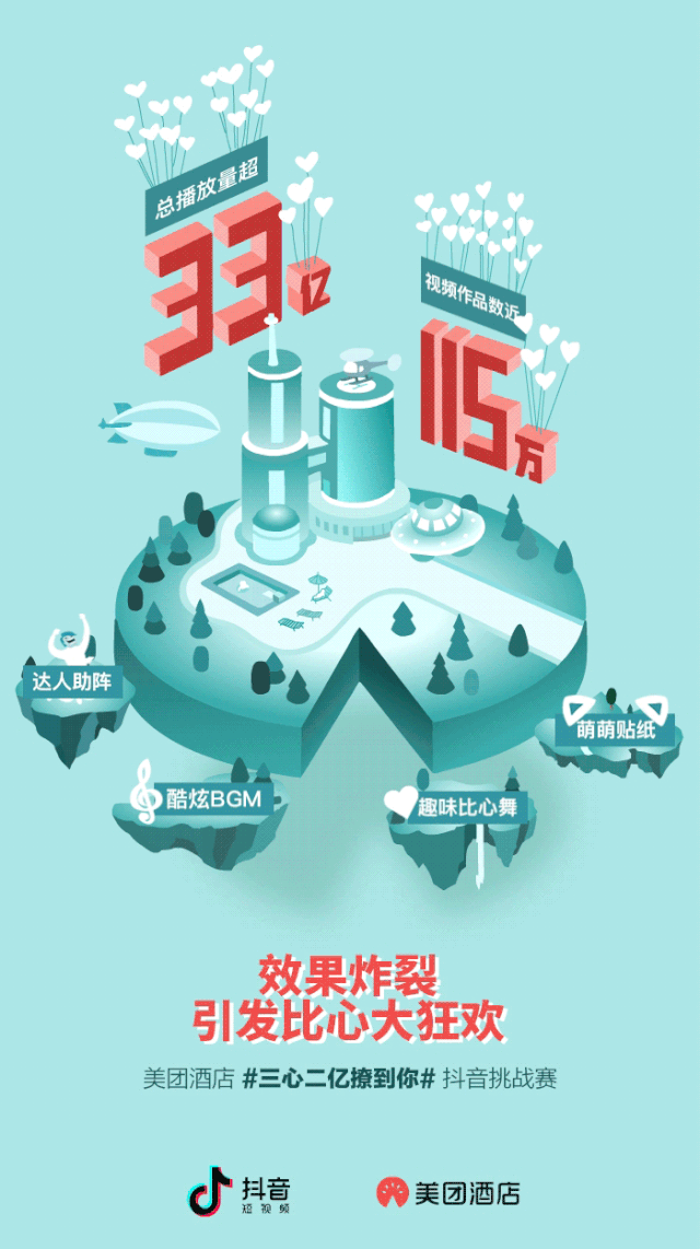 从海量曝光到转化带货,品牌营销诉求的变化对抖音的需求也不断提高,如何持续用好创新玩法值得探究。在2019年,完成了“美团订酒店,一年3亿间”品牌升级的美团酒店,顺势在抖音上策划#爱你不止3亿遍#抖音挑战赛,通过传播策略与对技术产品的应用,活动7日视频播放量创新高,突破45亿次,活动上线一周内吸引1.35亿点赞。回顾2018年,“一年订出2亿间”的美团酒店,借助抖音推出#三心二亿撩到你#抖音挑战赛,7日视频播放量达33亿,连续两年抢占抖音爆款热点。