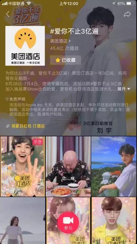 2019年,美团酒店的年预定间数已增长至3亿。为传递这一信息,品牌继续抢占抖音开屏、发现页banner、热搜榜、站内信等核心入口,启用郭冬临、刘宇等明星为品牌助阵,并策划#爱你不止3亿遍 热门话题,抢占用户关注。在获取更高流量的同时,美团酒店在互动玩法上进行升级。一方面在品牌贴纸中应用体感识别技术,可根据用户的手势触发特定动态效果。新鲜有趣的玩法在一周内,吸引17万用户使用该帖纸上传视频,作为一款带有明确商业信息的贴纸,互动量惊人。另一方面,品牌在达人视频中加入Link组件,可直接将用户引流至H5聚合页,打通跳转路径,提升转化效果。